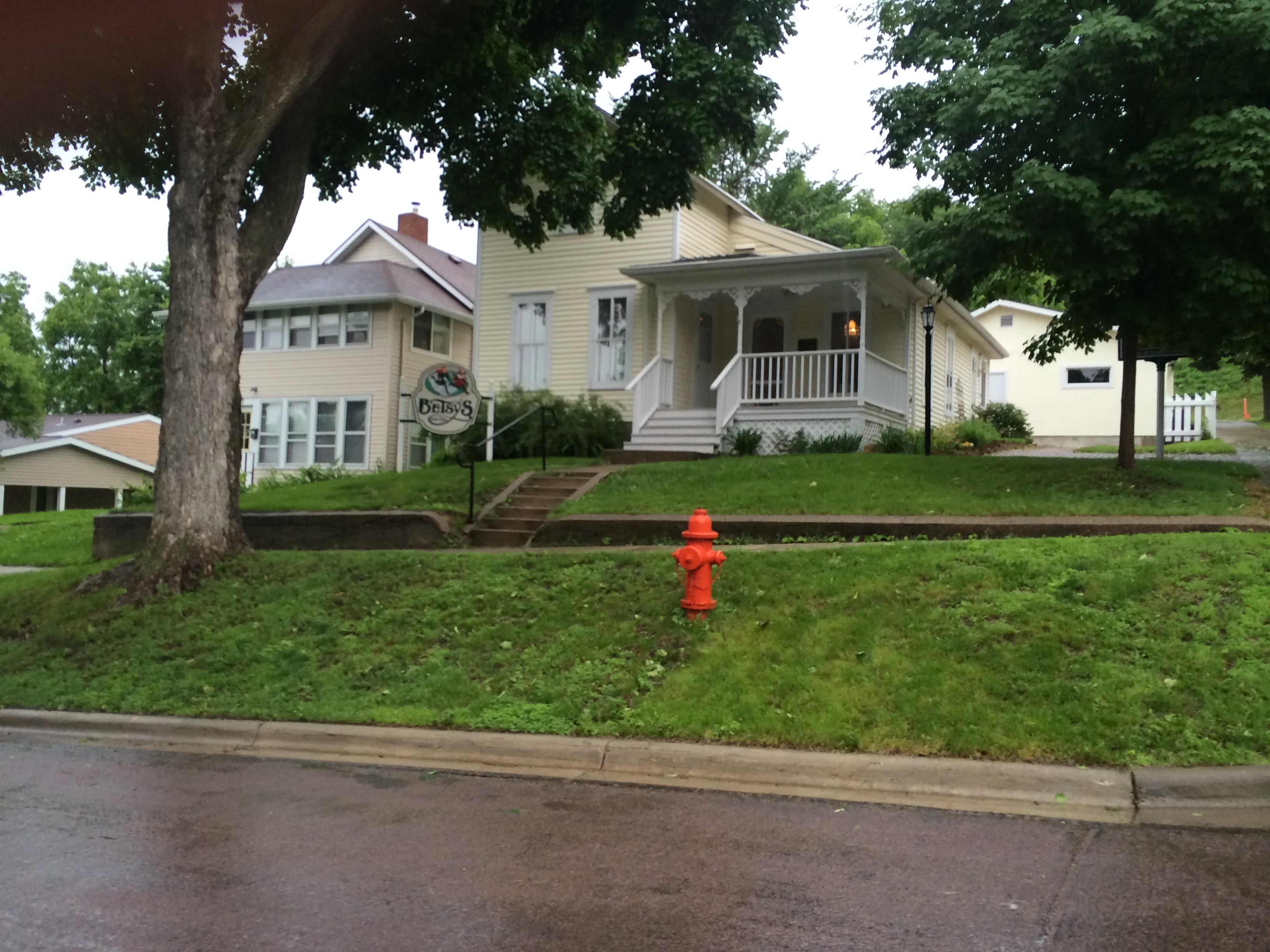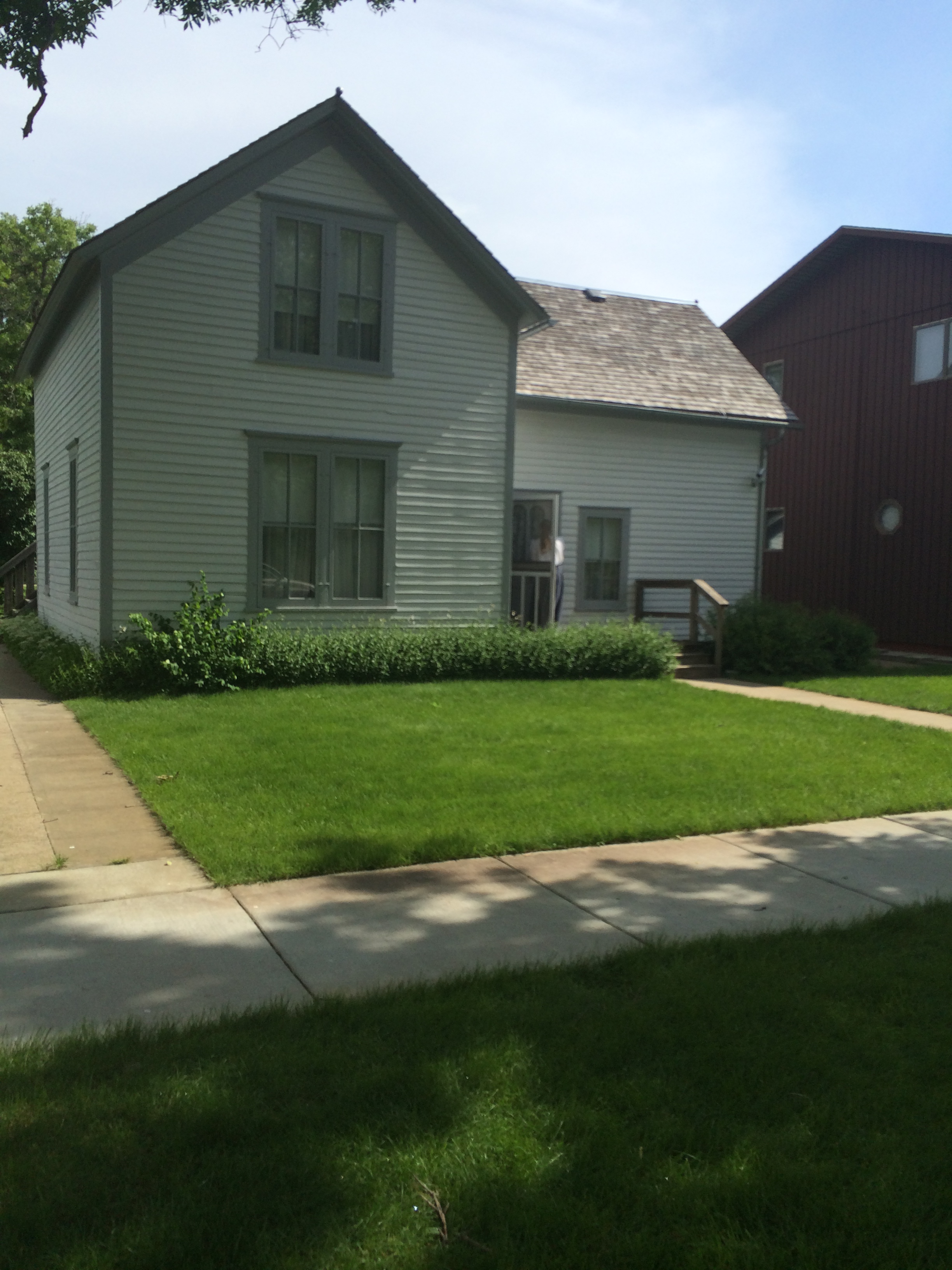 Day Two, Saturday, June 14. Minneapolis to Mankato: Tina picked me up at the hotel, and we hit the road by 8:00 AM. Our schedule was fairly tight: the Betsy-Tacy homes were only open from 1:00-3:00, and we wanted to visit the Big Woods site in Pepin, WI, first. We took the scenic roads that followed the Mississippi River from Minneapolis to Wisconsin. Fun fact: Lake Pepin is the widest spot on the Mississippi. The day was cool and overcast; rain threatened but didn’t hit until mid-afternoon. We reached Pepin, a charming village along the lake. The Laura Ingalls Wilder Museum was closed when we arrived (as was the nearby winery), so we drove seven miles to the Ingalls’ homesite in the Big Woods. Now, it is rolling farmland, but here and there, one can see patches of thick woods and imagine Pa hunting a bear or panther. We walked around the rebuilt little house. Back in town, we visited the museum, which contained a few items belonging to Laura and her daughter Rose Wilder Lane. Most of the collection, the museum employee told us, is found at Laura’s home in Mansfield, Missouri. We left Pepin and drove to Rochester, Minnesota, where we picked up U.S. Route 14, which would take us west to Walnut Grove and then to De Smet. But, first, a stop along the way in Mankato, the fictional Deep Valley of Maud Hart Lovelace’s wonderful Betsy-Tacy series.