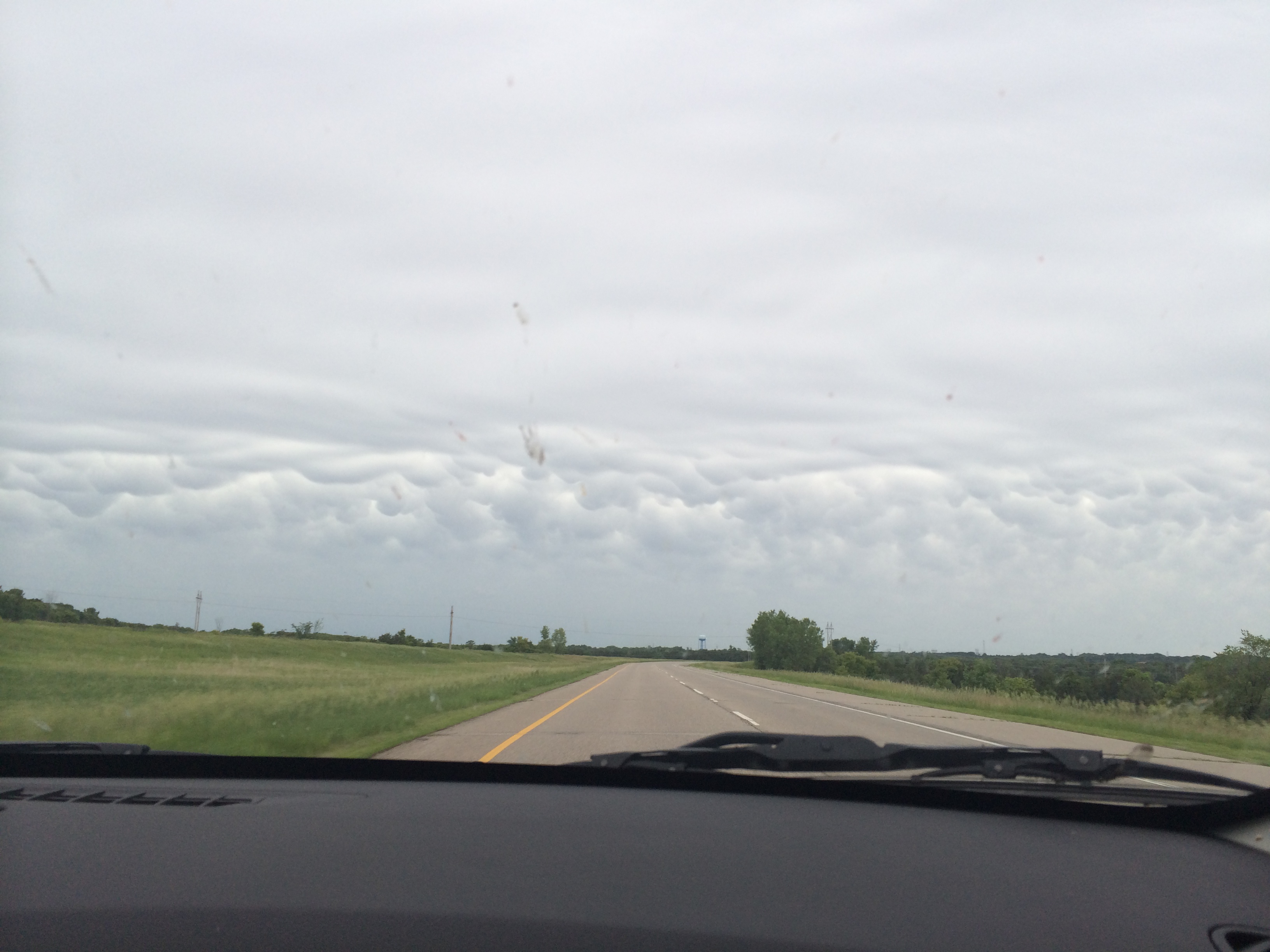 Avoiding storms on Monday’s trip back to Minneapolis. Not the greatest shot, but these are some mammatus clouds on the horizon. (Katherine Hart, 2014)